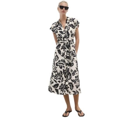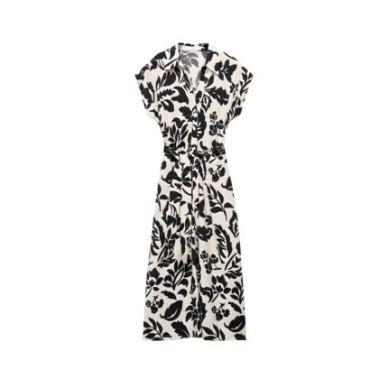 Voxlena Monochrome Floral Shirt Dress with Belted Waist and Relaxed Silhouette