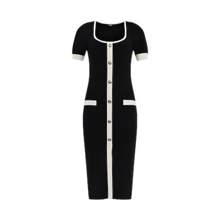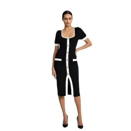 Voxlena Contrast Trim Knit Midi Dress with Buttons and Elegant Tailored Fit
